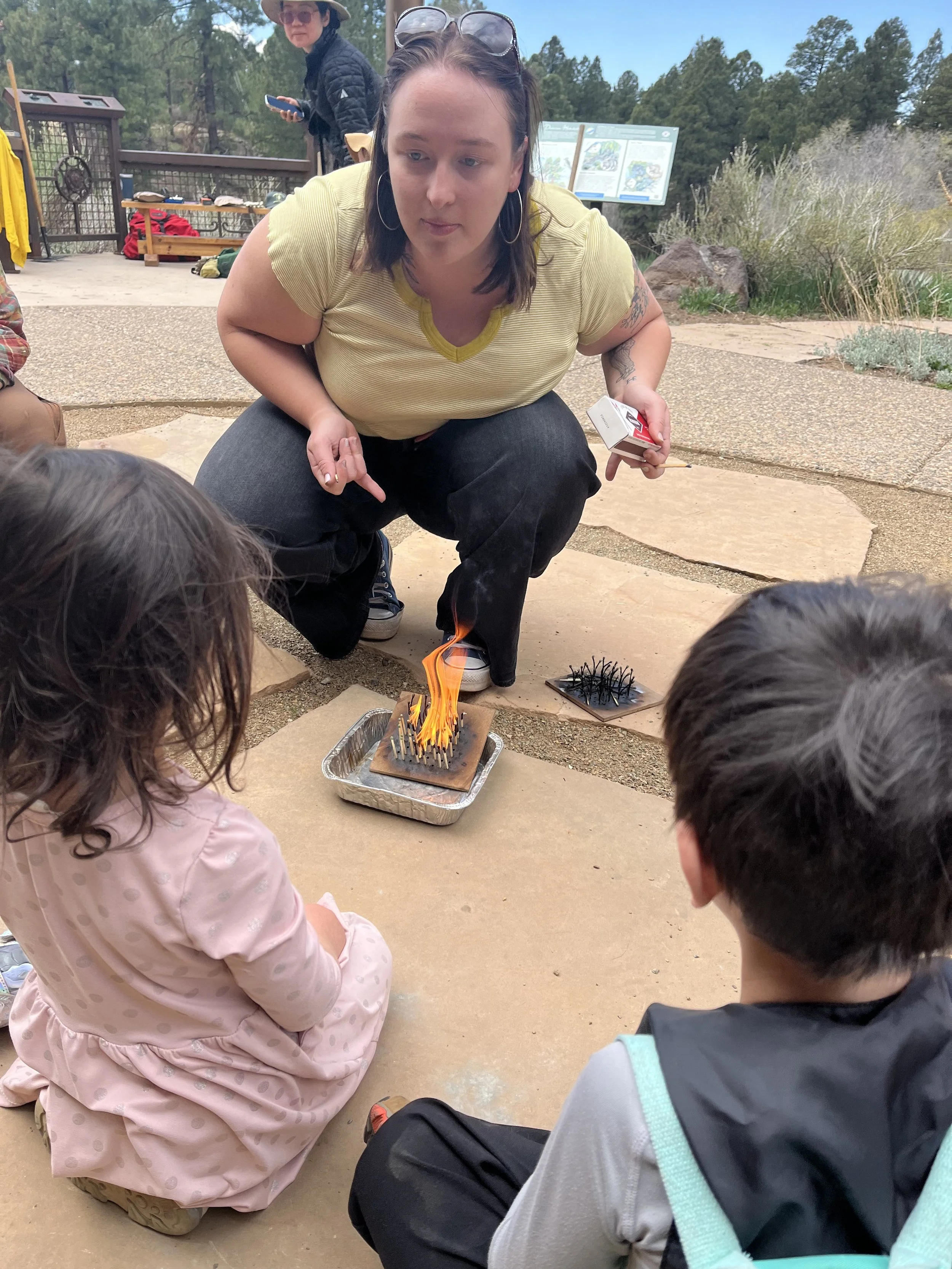 Students study different ways that fire can move through a landscape, the elements of the fire triangle (oxygen, ignition/heat, and fuel), and how Ponderosa Pine forests rely on fire through games, visuals, and hands-on activities. Students will be able to differentiate between healthy and unhealthy fires, and understand the historical importance of fire on Northern Arizona’s landscapes.